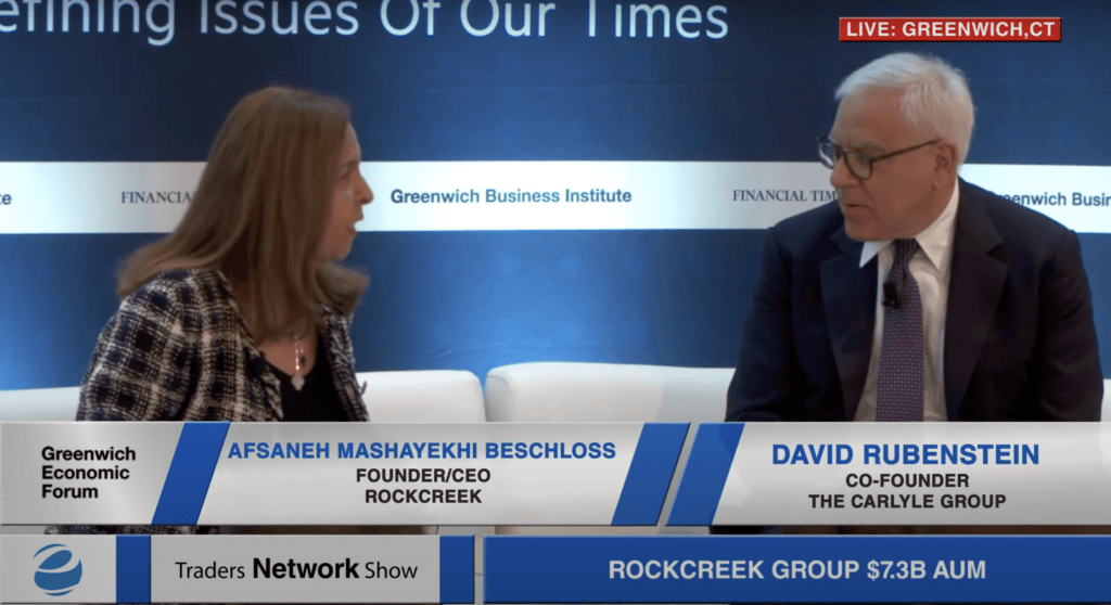David Rubenstein and Afsaneh Mashayekhi Beschloss Deliver Fireside Chat at Greenwich Economic Forum ESG News • January 7, 2022 Afsaneh Mashayekhi Beschloss interviews David Rubenstein, Co-Founder of the Carlyle Group on ESG Investing at Greenwich Economic Forum