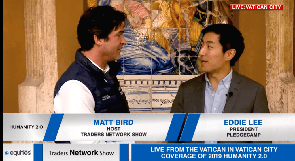 Eddie Lee President of Pledgecamp Interview with Matt Bird at Humanity 2.0 ESG News • December 7, 2021 Eddie Lee, President of Pledgecamp discussed crowd funding technology with Matt Bird at Humanity 2.0 (Vatican City)