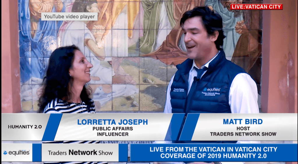 Loretta Joseph Public Affairs Influencer Interview with Matt Bird at Humanity 2.0 ESG News • December 6, 2021 Loretta Joseph, Public Affairs Influencer discusses technology and human flourishing with Matt Bird at Humanity 2.0 (Vatican City)