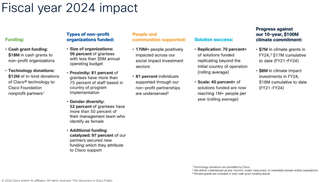 Looking at our fiscal year 2024, we were able to positively impact over 170 million individuals globally working with over 100 nonprofits. More than half of our grants went to smaller nonprofits which demonstrated that small organizations can have an outsized impact. For example, 40% of our grantees delivered solutions that positively impacted over 1 million people per year. In addition, by being one of the firsts or an early investor, we’re able to help 97% of our partners secure new funding that they directly attribute to Cisco’s support due to the catalytic nature of our investments. This applies to both our nonprofit partners as well as our climate investments.We’re incredibly proud of the impact we’re driving in collaboration with our partners and will continue our grounded approach in not only giving cash grants and working with our parent company Cisco for technology donations, but assisting with strategy, resources, and other bespoke needs one may need for optimal impact.”